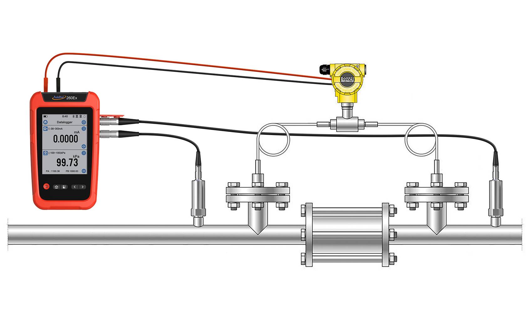 Additel's 260Ex is an intrinsically safe handheld multichannel reference recorder with 8 different channel configurations. Armed with Additel’s most versatile and capable handheld, technicians are now able to measure and collect data for pressure, temperature (RTD probes available), barometric pressure and electrical measurement all in one highly portable device. The powerful logging capability and high-level of intrinsic safety make the ADT260Ex the perfect companion for use in the pipeline industry by supporting hydrostatic pressure testing, air leak testing, inlet and outlet pressure testing at pump stations, safety valve and ex-proof membrane testing, wellhead pressure testing, pipeline filter testing, differential pressure transmitter/flow computing testing, as well as routine calibration of pressure devices.
