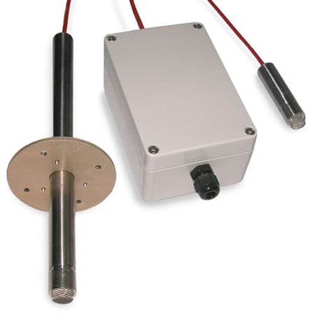 The HX15 series two wire remote transmitters measure relative humidity and temperature over a large temperature range (-40 to 180°C). The HX15-W 64 mm (2.5") stainless steel probe is used for wall mounting. The HX15-D 216 mm (8.5") stainless steel duct probe has a removable flange. The probes are connected to housings with 1 m (40") PFA cables. Probes are not field replaceable.- Choosing a selection results in a full page refresh.