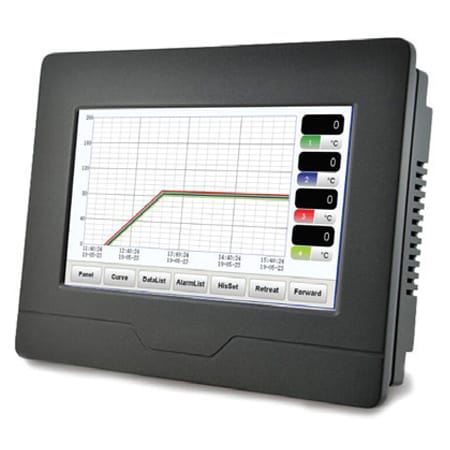 The RDA Paperless Multi-Channel Touch Screen Paperless Thermocouple or RTD Recorder Series is a value priced large format touch screen datalogger that integrates measurement, display, alarm, and datalogging into one slim instrument. The RDA Series is available in both 5'' and 7'' display models. The instrument is easy to install and requires no external HMI. Depending on the model, the RDA Series can support 2, 4 or up to 6 input channels with either thermocouple or RTD input type with 0.2% FS measuring accuracy. Each channel can have independent input specification, with square-root, multiplication, addition and subtraction. All channels are equipped with digital adjustment and filtering functions. The RDA Series provides a real time trend records via trend graph or bar graph. History and alarm records can be reviewed in the logger itself with 150MB of internal storage or exported to external USB storage device. The RDA-740 and RDA-760 models have a slim installation depth of 40mm of for use where installation space is limited.