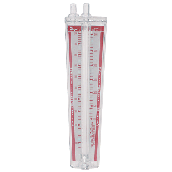 Simple and quick, the 460 Air Meter is popular for servicing air conditioning, heating and ventilating equipment. Direct reading velocity and static pressure scales — both low and high ranges — show supply and return grille velocities, furnace draft, pressure drop across filters, etc. The 460 gives consistent, accurate results with no tedious calibration. Rugged plastic for rough daily use. Dual velocity ranges read 260-1200 and 1000-4000 FPM; pressure ranges from .005-.09 and .05 -1.0 in w.c.