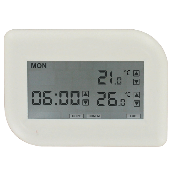 The MODEL TLVT1 Digital Touch Screen Programmable Thermostat with Heat Pump simplifies controlling indoor temperatures in commercial and residential buildings. A large easy to read LCD display shows the current temperature, set point, as well as time and day of the week. By touching the icons on the display, building occupants can temporarily change the set point, edit the weekly program, or select the control mode. For larger offices or homes, a single thermostat can control up to two heating and two cooling units. For Heat pump applications, the thermostat can control a two stage compressor. To make programming the time easier, there is a daylight savings time function that will automatically change the time based on the US time change dates. To prevent tampering, the Model TLVT1 has a security code feature that can lock out the programming. For additional energy savings, the filter, UV and energy usage timers tracks the number of hours the fan, heater/cooler, and thermostat is powered on. Additional energy savings can be achieved by programming the thermostat for up to 4 temperature events for each day of the week.