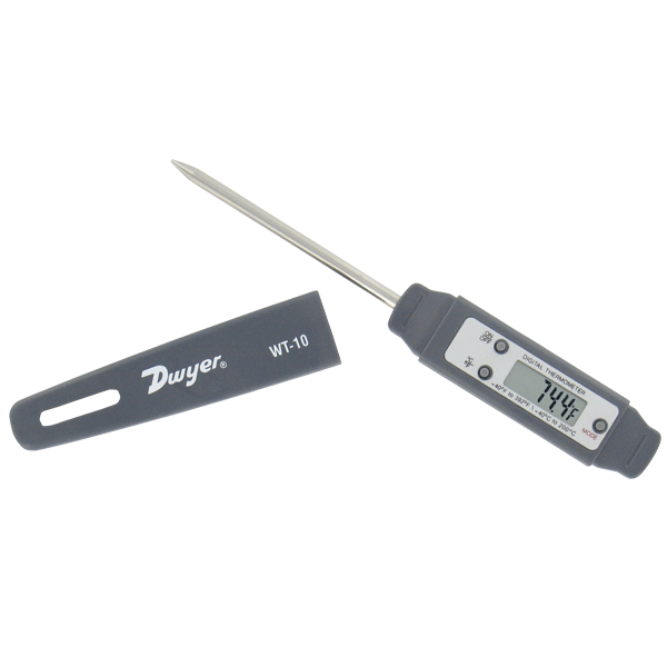 Completely submersible, the pocket size Model WT-10 Waterproof Thermometer is designed with a waterproof housing and a 2.75" (70 mm) stainless steel stem. The unit offers dual scale temperature measurements up to 392°F (200°C) on the 3-digit LCD display. The WT-10 comes complete with protective cover to store the unit while not in use. The features include MAX/MIN recall of high and low temperatures, hold, switchable °F or °C and auto shut off. Ideal applications include laboratory, food and beverage, HVAC and scientific markets.
