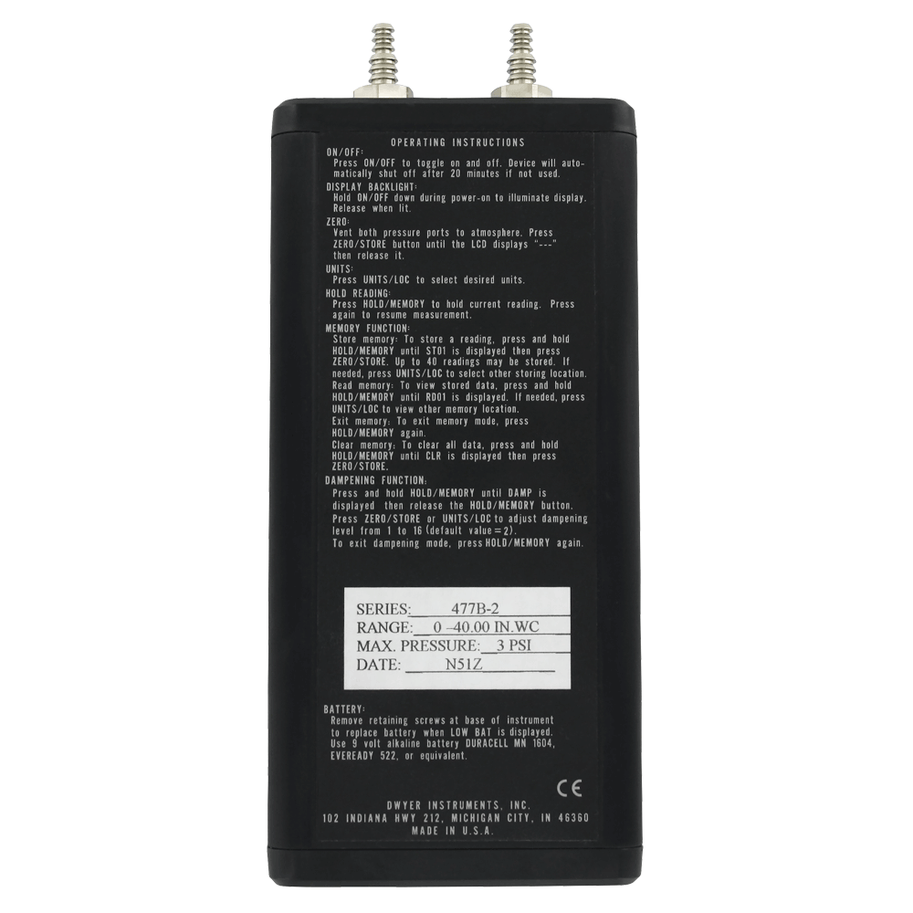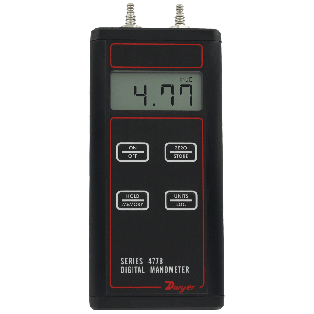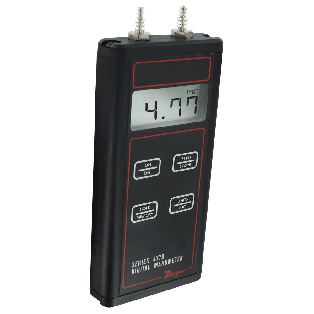 The SERIES 477B Handheld Digital Manometers are versatile, hand-held, battery operated manometers available in several basic ranges from 0-20 in w.c. up to 100 psi. All models measure either positive, negative or differential pressures with ±0.10% of full scale accuracy. You can select from up to seven common English and metric pressure units so conversions are not necessary. A memory function allows storage of up to 40 readings for later recall and a backlight provides auxiliary lighting for hard-to-see locations. Also standard are a hold feature plus both visual and audible overpressure alarms.