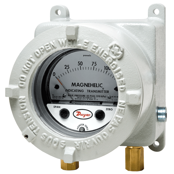 The ATEX approved SERIES AT2605 Indicating Transmitter provides for both visual monitoring and electronic control of very low differential pressure in hazardous locations. The easily read dial gage is complimented by the two-wire, 4 to 20 mA control signal utilizing the time-proven Dwyer® Magnehelic® gage mechanical design and Series 600 transmitter technology. The two-wire design simplifies any 4 to 20 mA control loop powered by a 10 to 35 VDC supply. Flame-proof ATEX enclosures are available in aluminum and can include a glass window for viewing process pressure on gage face.