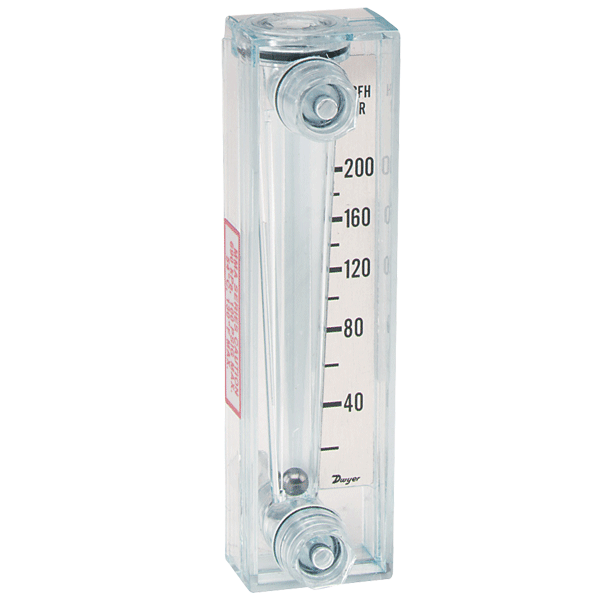 Where a compact flowmeter is required to measure small volume air flows, the Model MMF is recommended. Easy to mount, they require a minimum of panel space. A white back on the flow tube makes the ball float easy to see. The scale is highly visible and easy to read. Scale graduations are printed on aluminum alongside the flow tube (not on it), so the position of ball float is instantly visible.